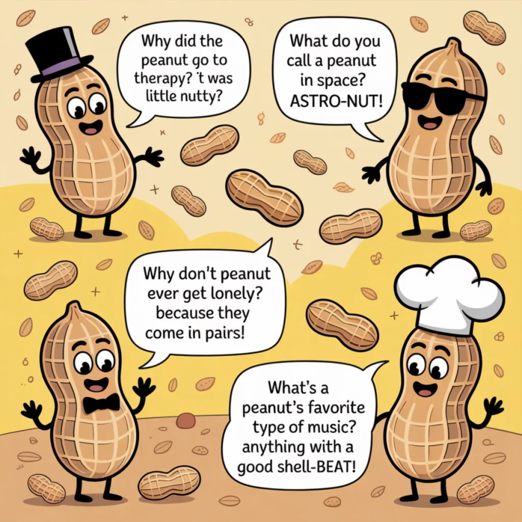 Peanut jokes are short, simple, and easy to remember. Their playful wordplay makes people of all ages laugh without any effort.